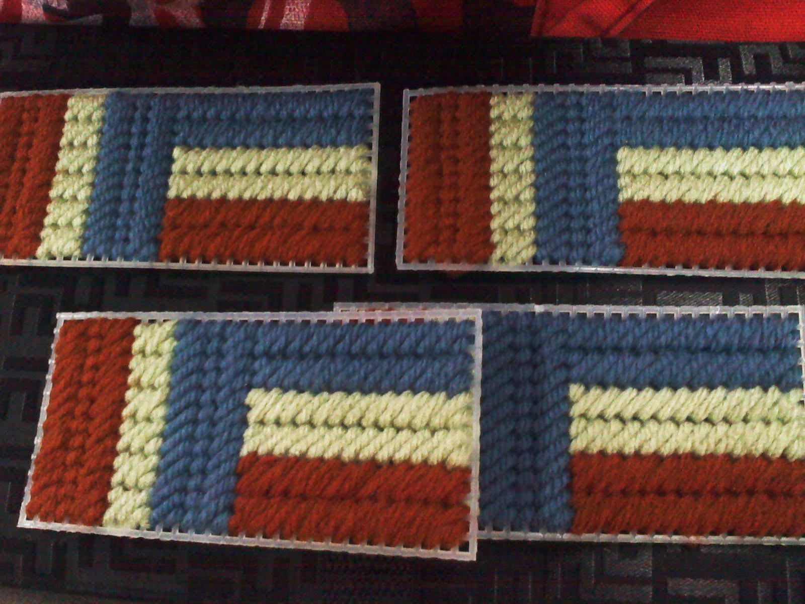 Detail of one of the side pieces. I doubled up on the brown yarn, since it was more of a DK weight than the other two, which were worsted weight (the green, even, seemed a little on the bulky side).