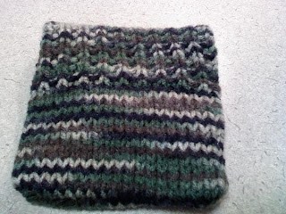 And here is the back in all its glory. I did the top part in a garter rib pattern that actually looks quite nice in this yarn; I may do the whole thing next time in that stitch for added padding against the camera body.