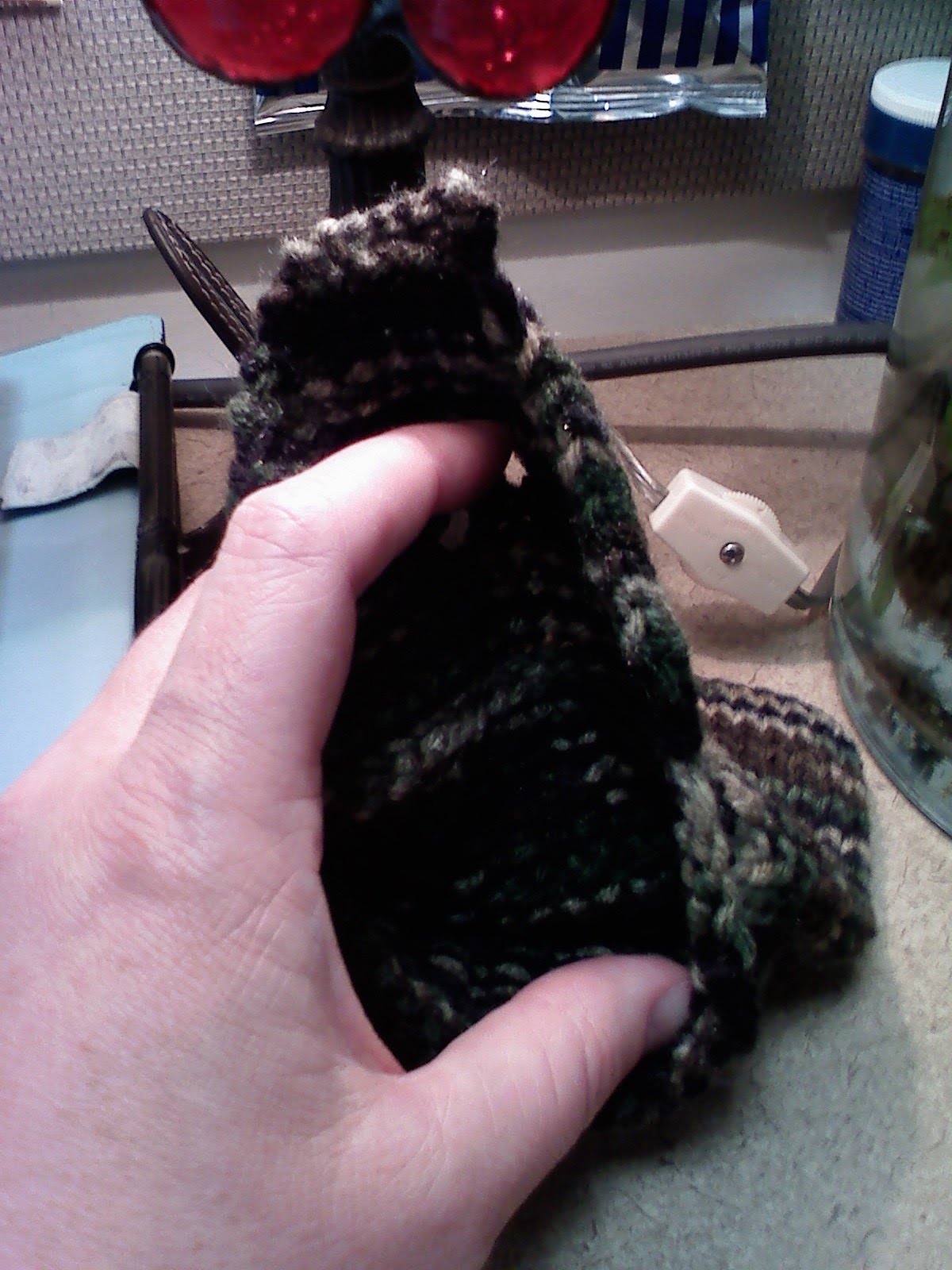 So this bag. Well, it’s a camera bag, for a wee little bitty camera of a thing. So I knitted a swatch, and I knitted a sock, and I closed the sock with the three needle bind off, and I picked up the gusset for the lid, and I knitted the lid.