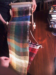 This is the final piece, all wound back on, ready to go back to class to take the fabric off the loom. I ended with a clear royal blue, since I couldn’t get all the way into the violets. Not a bad day’s work – well, really, four days’ work!