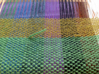 Here is a close-up of the light green. The little string sticking up is actually woven into the fabric at the sides when you change colors, then clipped at the end of the process. I started clipping once they wove in, so I didn’t have as much to do when I pulled the fabric off the loom, which is something I’ll continue to do.