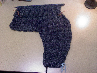 After that, finishing the left front piece was a snap. Here it is, using the simple expedient of an extra knitting needle as a stitch holder: