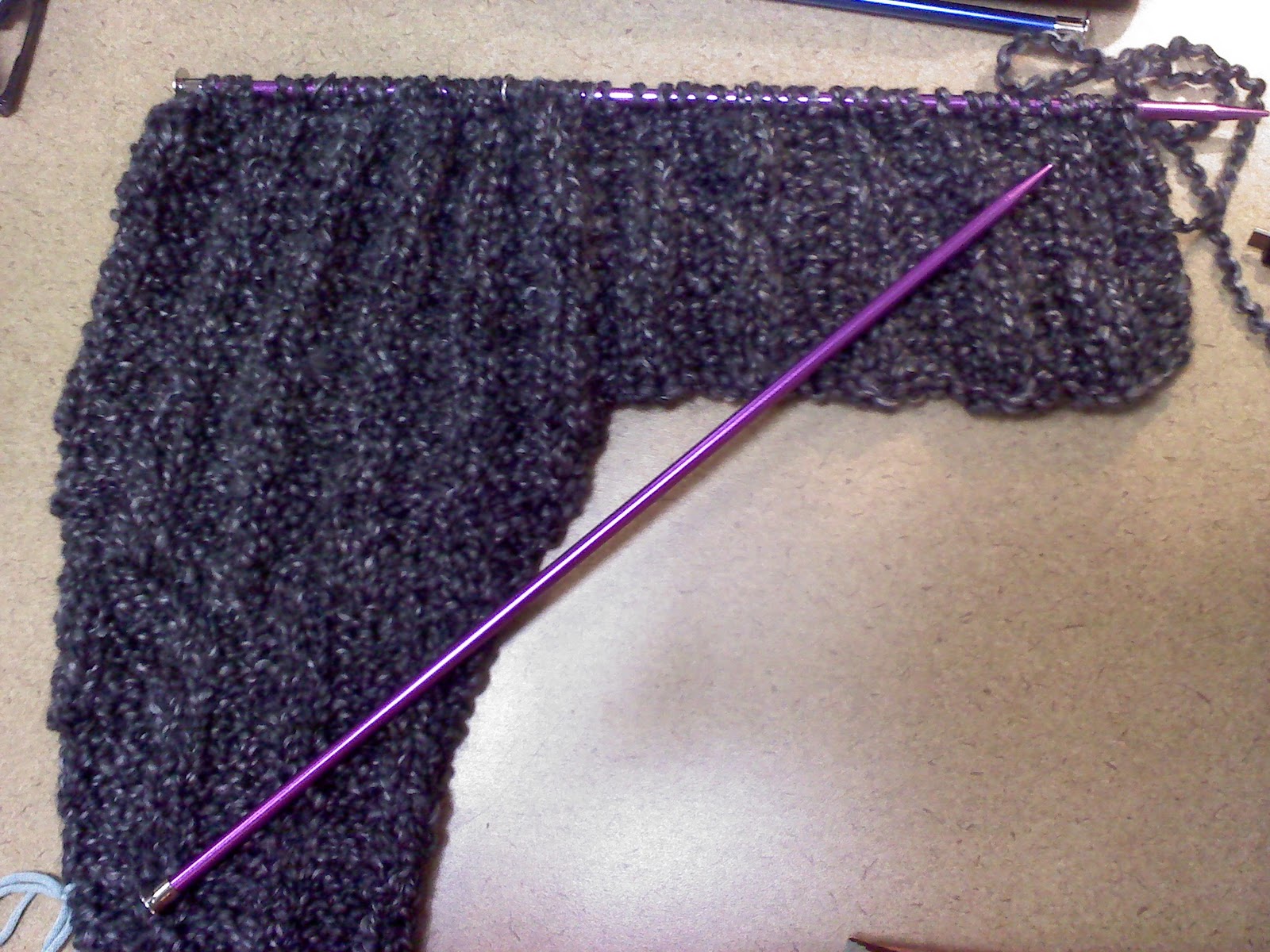 After that, finishing the left front piece was a snap. Here it is, using the simple expedient of an extra knitting needle as a stitch holder: