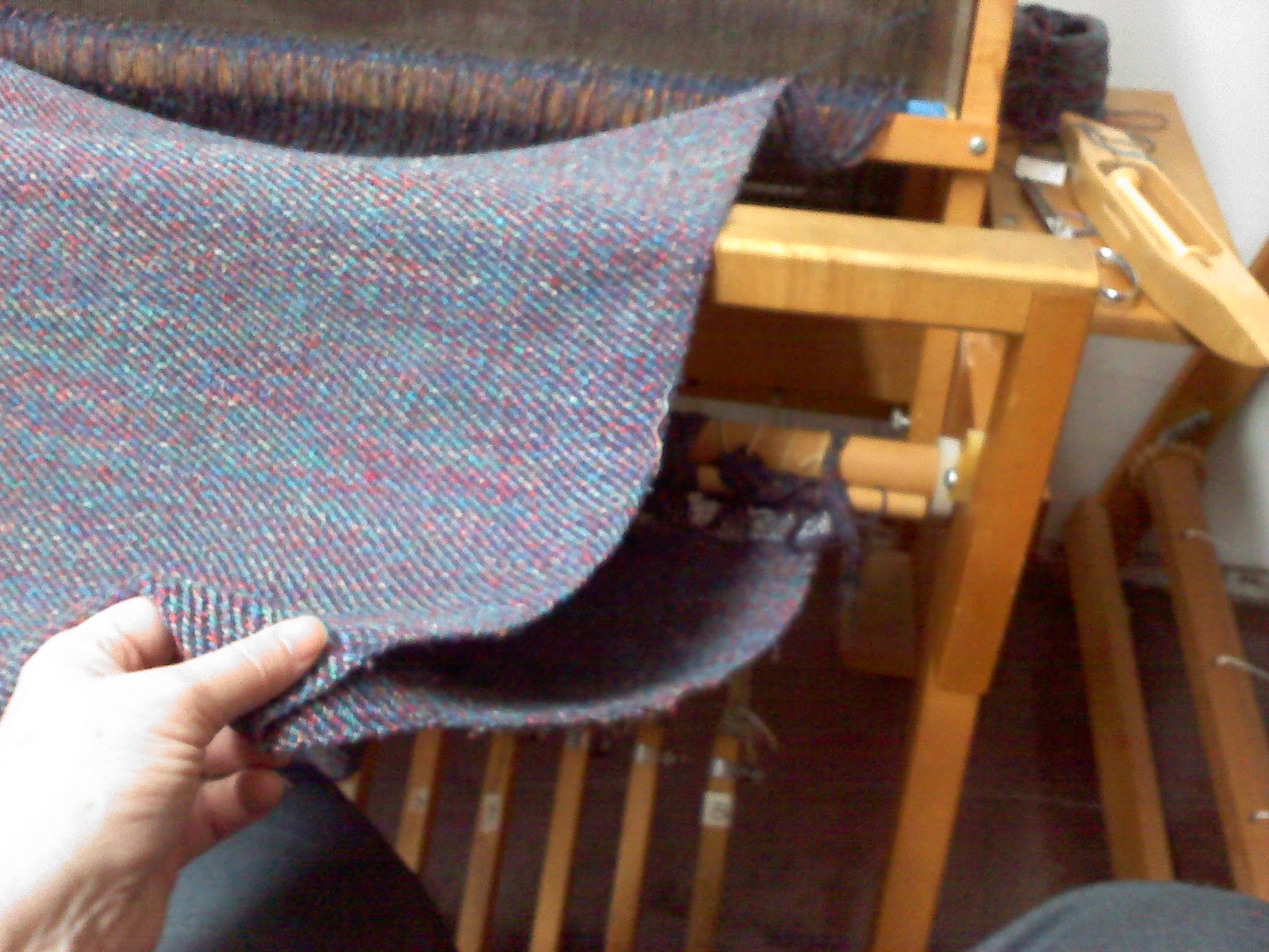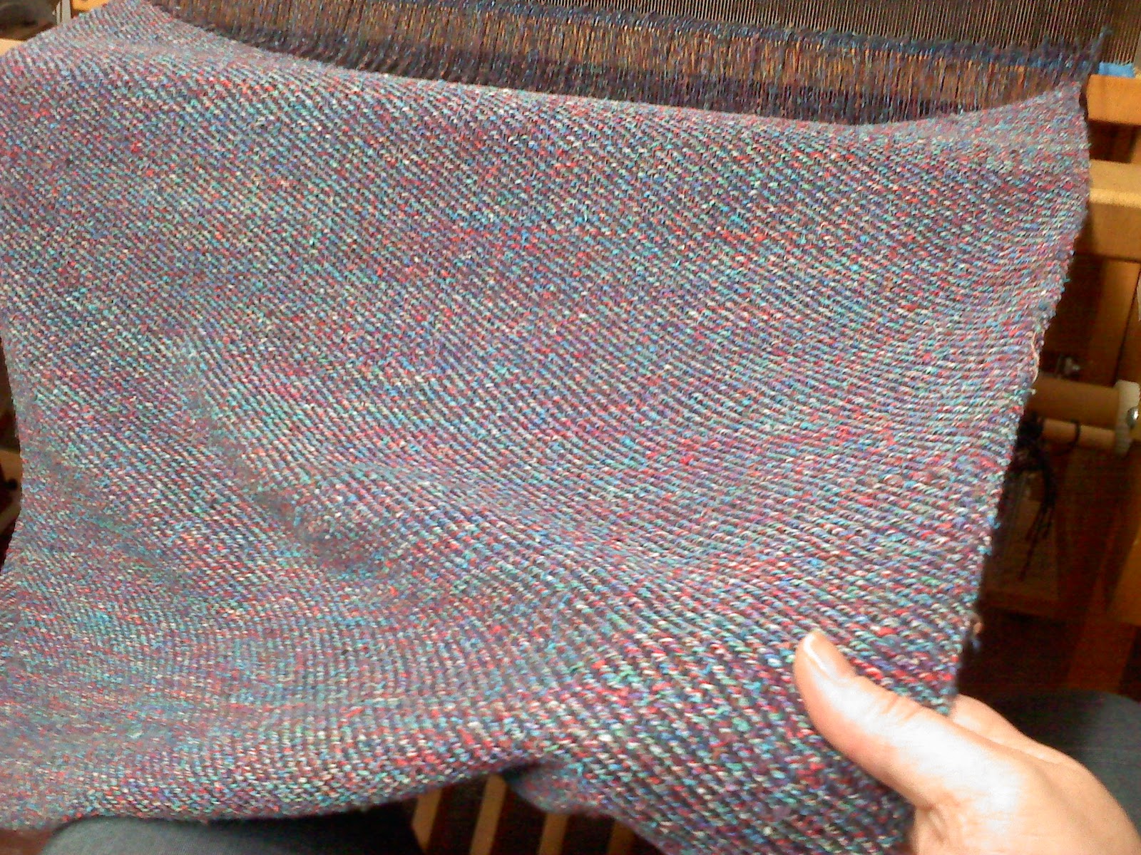 It feels a little bit like denim, but much softer. It’s a rayon blend and I love it. As I weave, it creates a lot of fuzz; I hope that isn’t a property of the finished fabric after blocking.