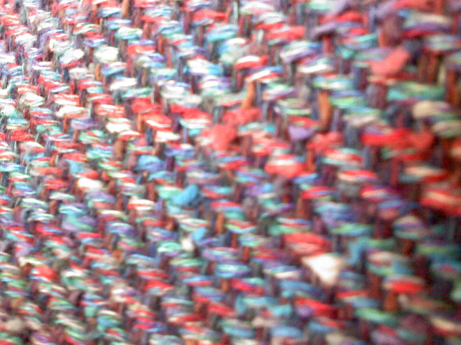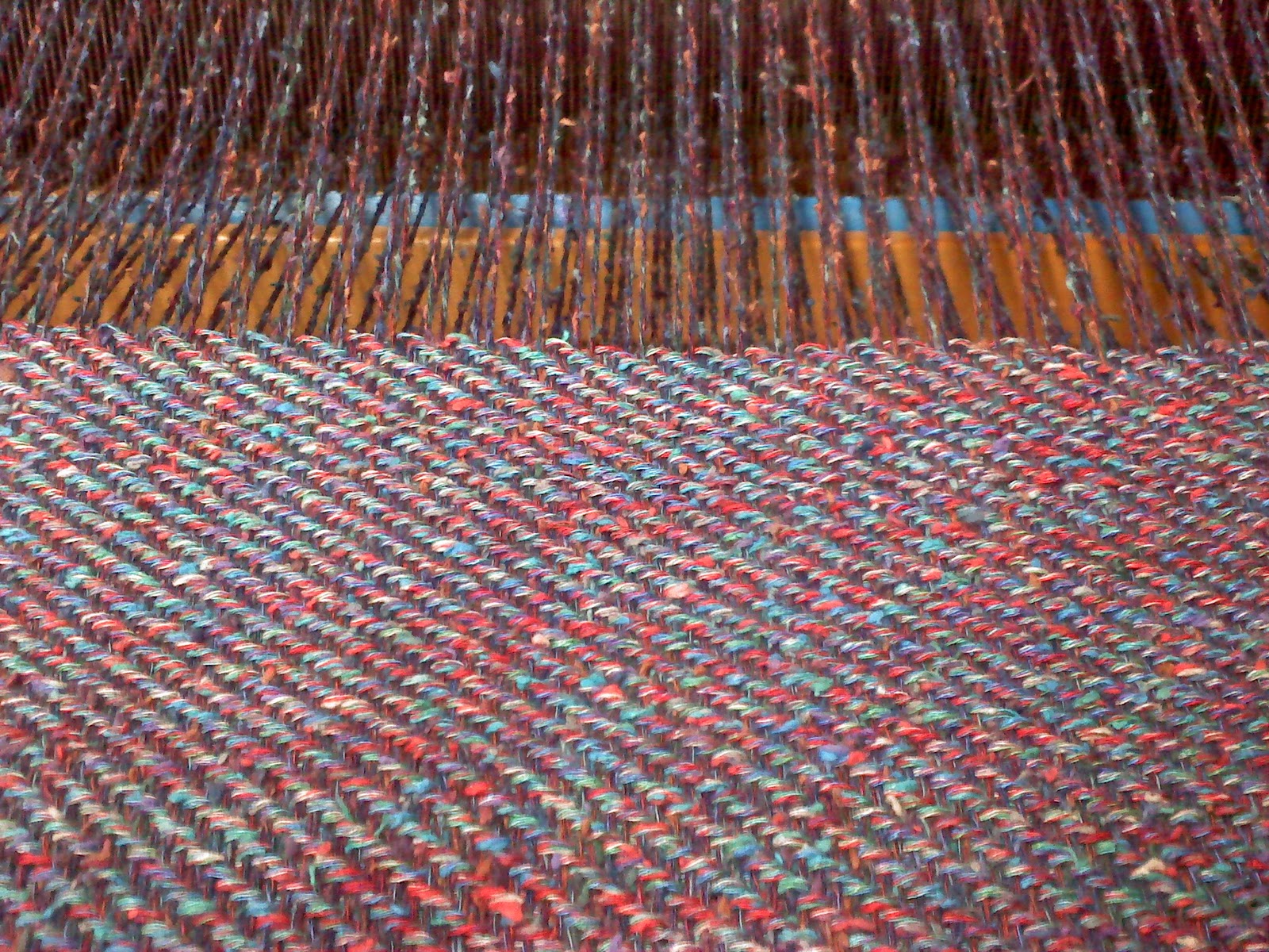 Here is a view of the fabric. The bottom two-thirds of the image is the actual fabric, and you can see the diagonal striping leading from the bottom right to the top left. This is the characteristic of the twill family of weave structures. Beyond the fabric, at the top of the image, are the warp threads waiting to be woven. The warp is a darker tonal family than the weft (the warp are the vertical threads, the weft are the horizontal ones); the combination of the two is surprisingly pleasing.
