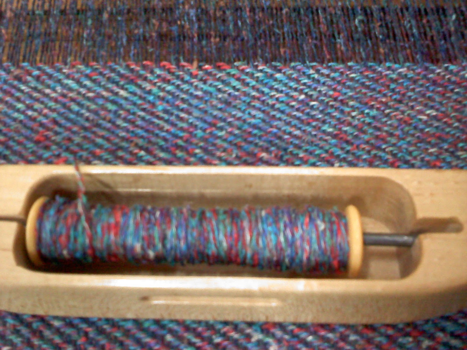 This final image is the boat shuttle, so named because the bobbin of thread sits inside the shuttle on a peg. This allows the weaver to load multiple bobbins and not have to get up each time the end of the thread is reached. It’s taken a little bit to get used to how wide this loom is; my last project wasn’t this wide. But once I got the hang of it, it’s rather fun to whiz back and forth.