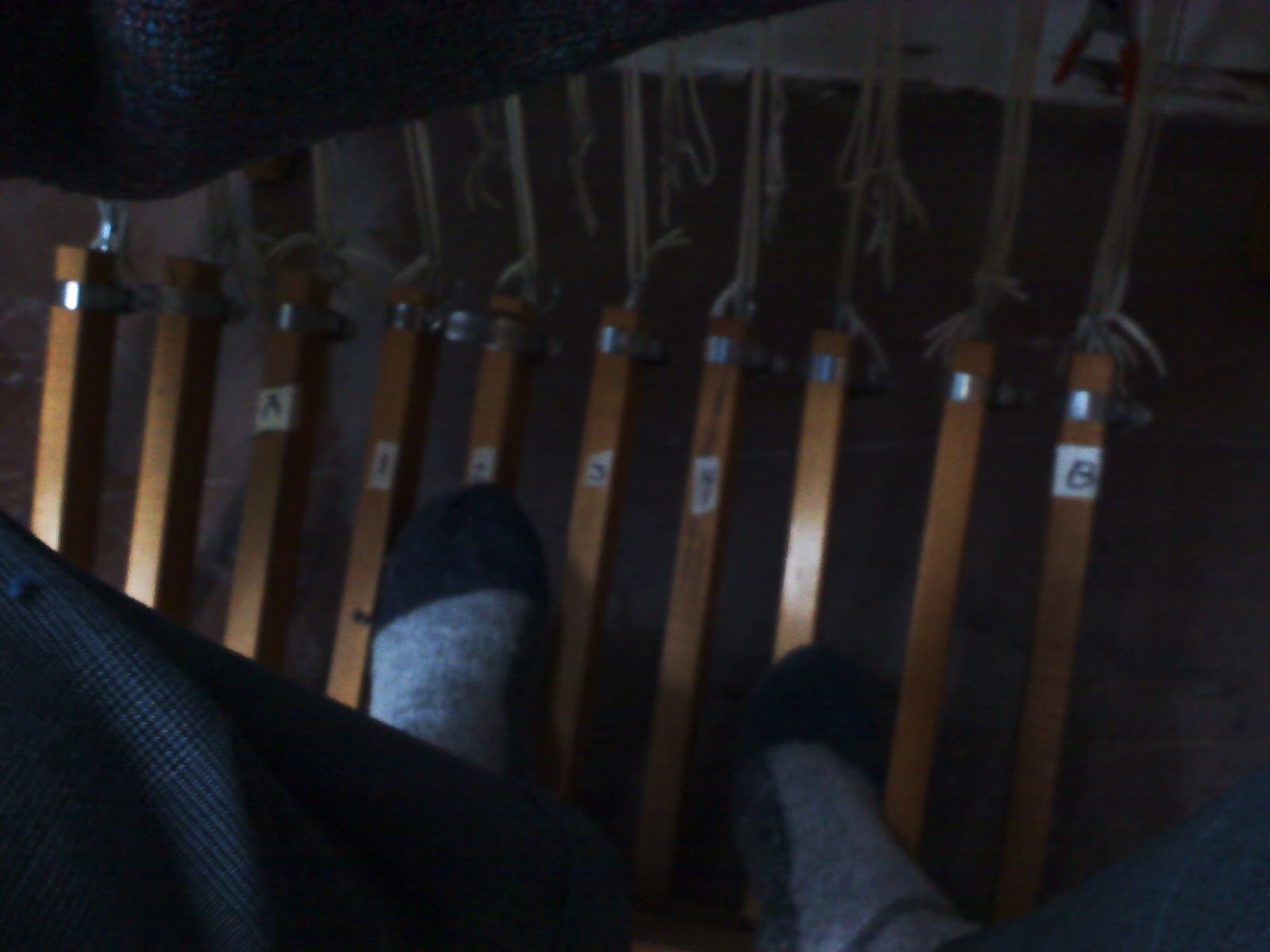 As I mentioned earlier, the heddles are controlled on this loom by foot pedals. The cool thing is that the foot pedals are variable: you select which heddles correspond with which pedal. For my project, you can see there is an A, a B, and 1 through 4. A and B are set up for plain weave, and the 1 through 4 are set up as a 2-2 twill. That means that for each pedal, two heddles are controlled – this way, I just have to press 1 through 4 in succession and I have my pattern.