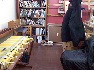 ‘My’ loom is in the back on the left. In the foreground on the left is another floor loom, and the yellow threads are the warp of what will be a blanket. The bookshelves are the weaving library, and the odd shapes on the right are, in the foreground, my jacket over a chair and behind that my classmate’s coat hanging on the corner stantion of a giant floor loom.