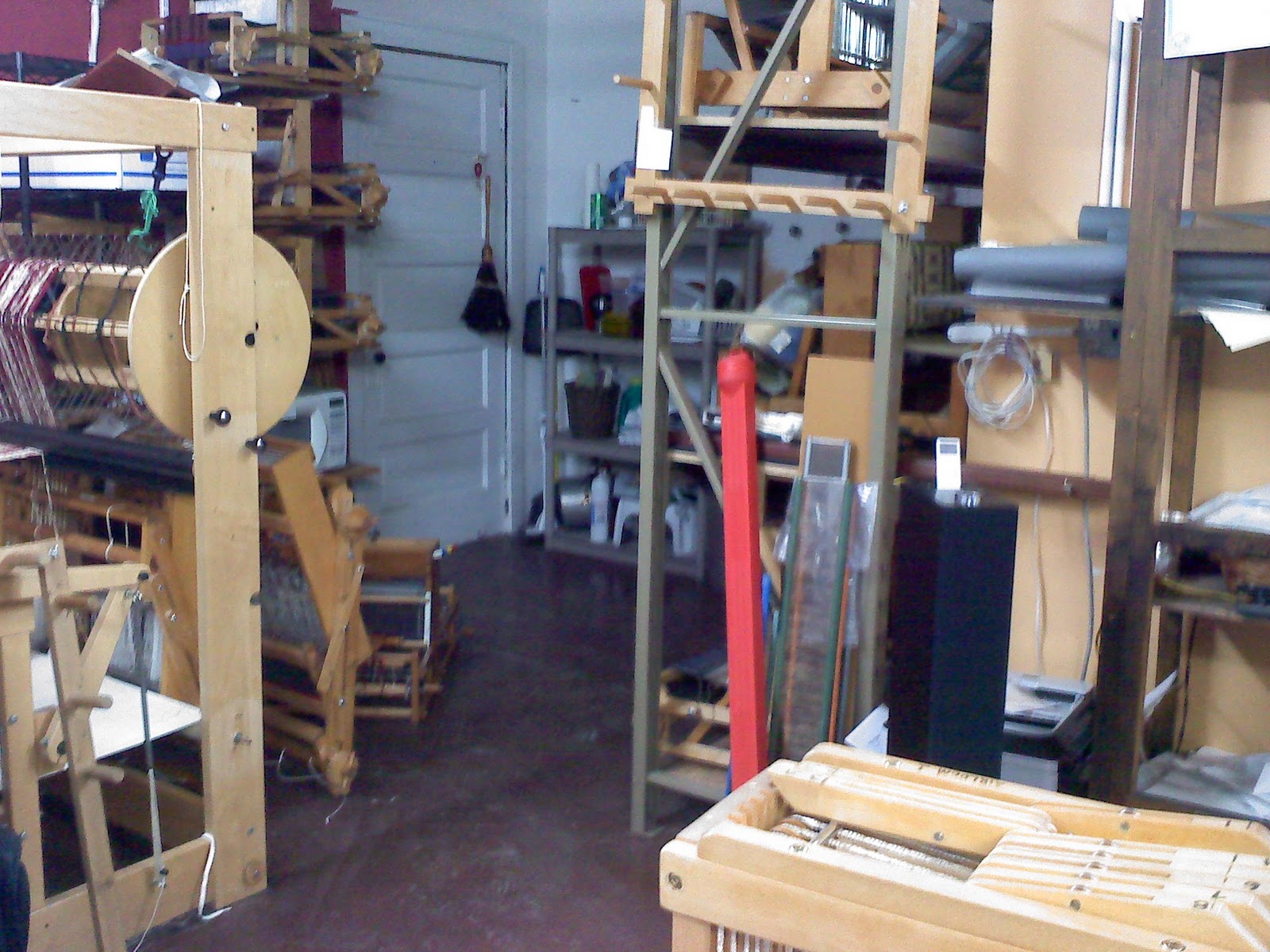 This is looking toward the front of the school. The center table is the main worktable, and looks different each time I come depending which students will be working. When not in use, those table looms go on shelves. On the left is a floor loom with a blue warp; beyond it are three more floor looms and a large wooden contraption for winding lengths of warp threads. It’s got a name but I can’t call it to mind at the moment.