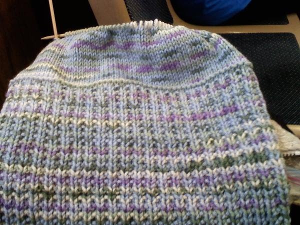 My bag is coming along. I’ve finished the main body, and put in a round of purl stitches for a fold. Then the lining is stockinette.