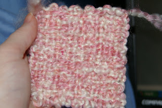 Okay. Here is the first swatch I did. I couldn’t get the edges to lock, so it’s not stable; but I like the look. It’s Lion Brand Homespun in a colorway I don’t recall from a couple years ago. The weaving came out a lot flatter than the knitted version looks.