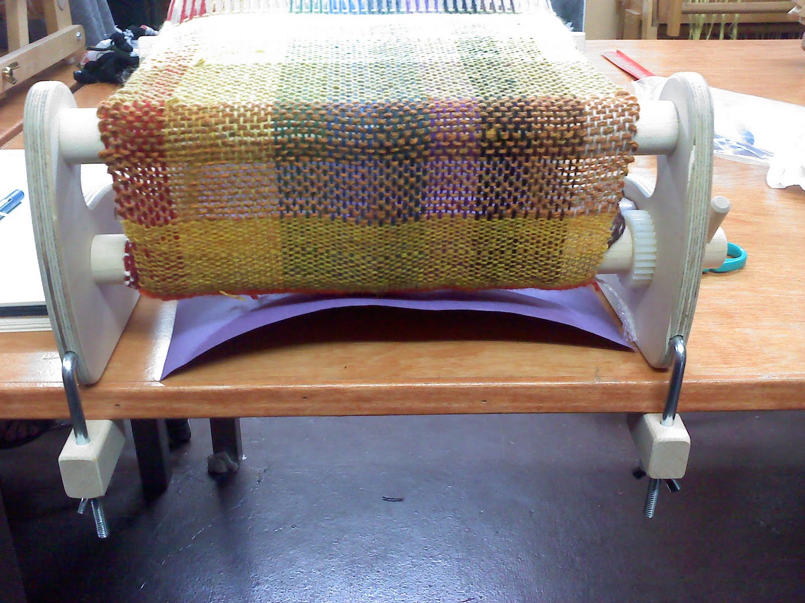 Here is a front view of the loom with the fabric; there’s quite a bit finished already. The two clamps hold the loom to the table – which, having forgotten them the next lesson, I have decided are very necessary. It keeps the loom from jumping back and forth.