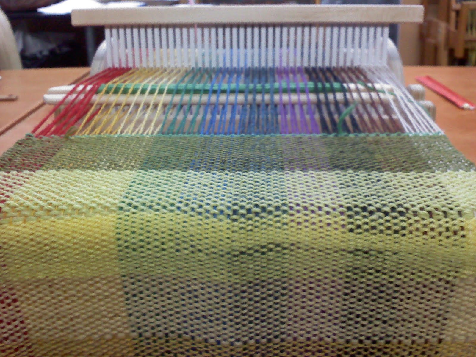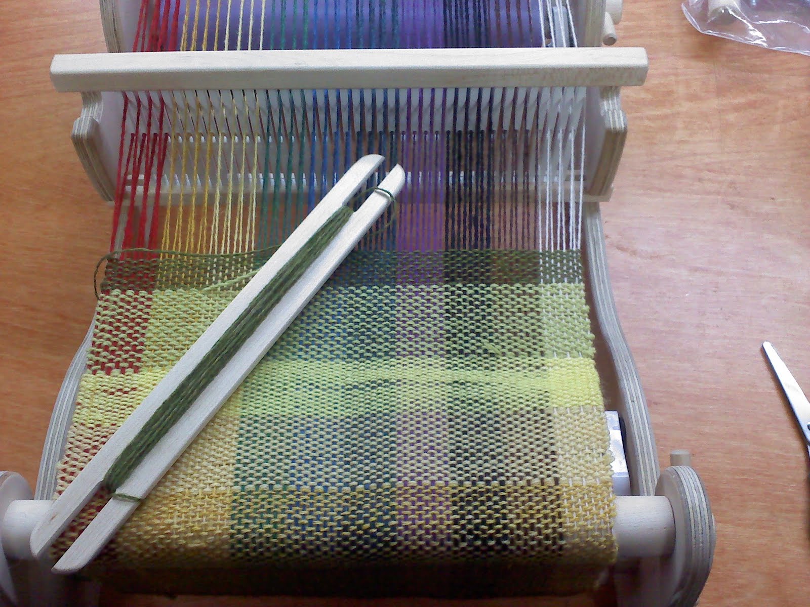 Here is the weaving with thread already on the spool for the weft; we’ve progressed up to green tones at this point.