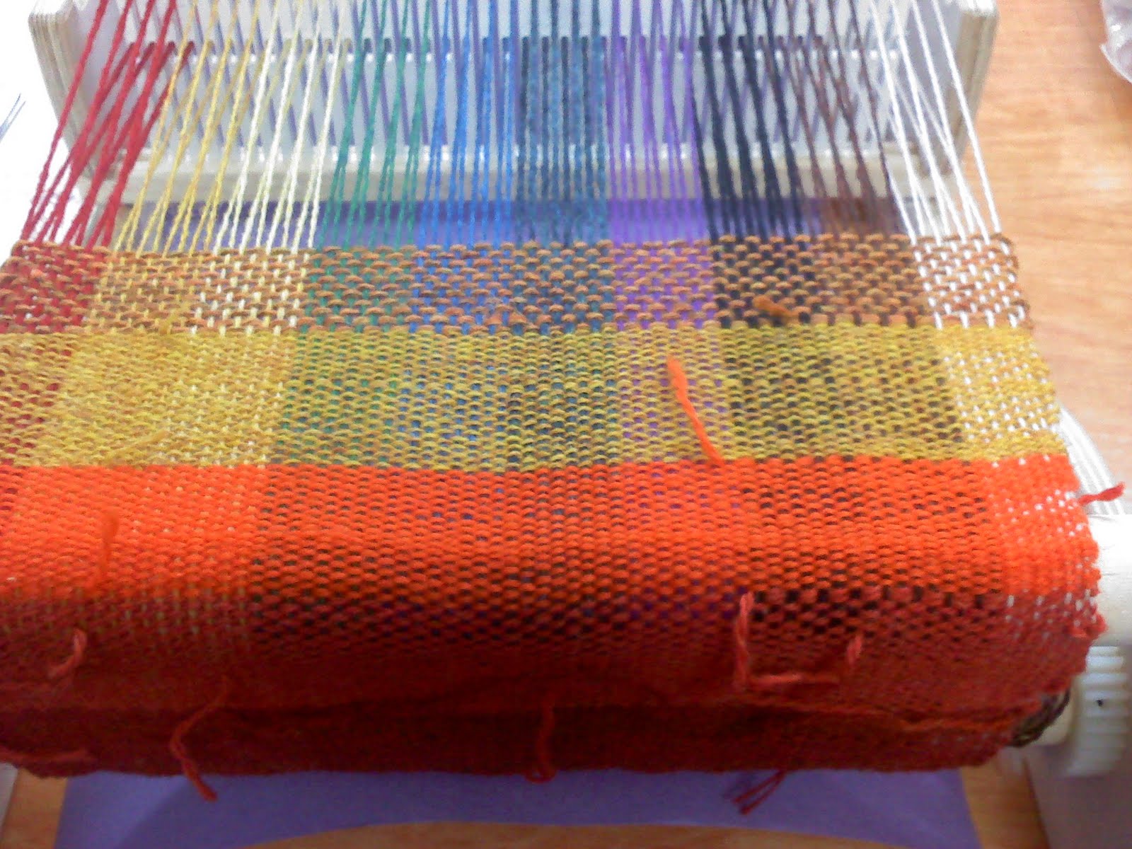 Closeup of starting the orange segment. This is what’s called a ‘plain weave,’ which is where every other thread of the warp is lifted and the weft is passed through. Other patterns can be made by moving the warp differently, but those patterns are easier on a harness loom because the heddles can be controlled more precisely.